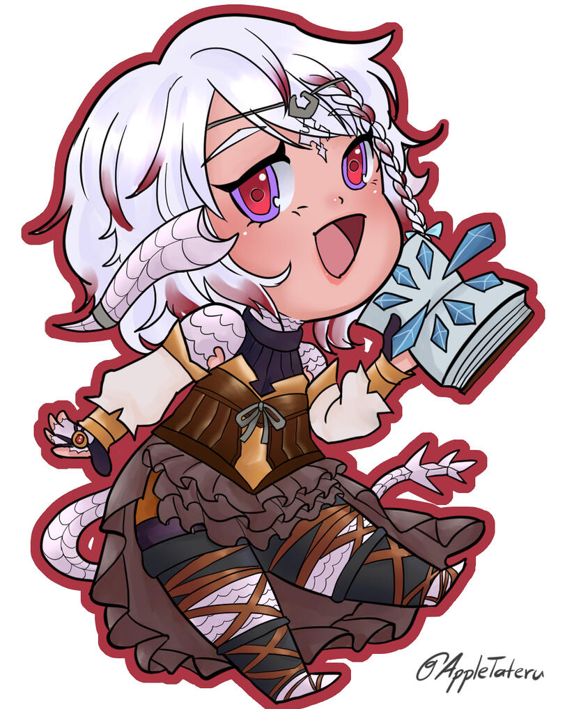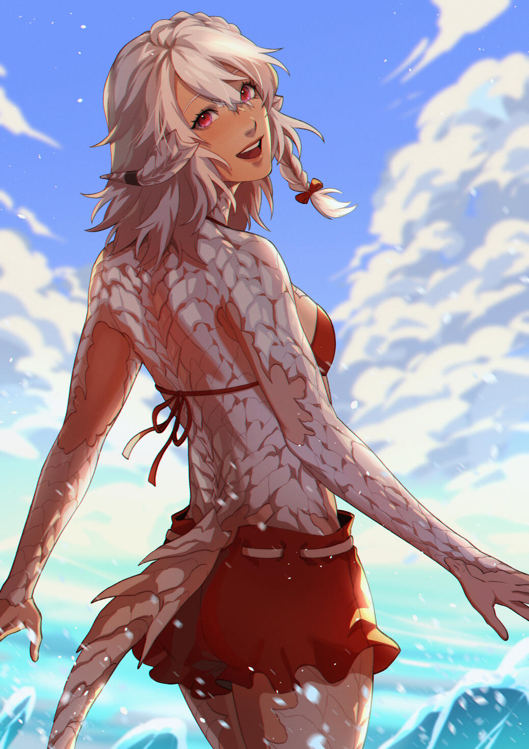 How she got her White Scales: During her visit to the First she defeats all the Lightwardens gaining all thier light, while doing so she was about to turn into one, which made her scales all white in the process. After a while her scales has became more frequent, growing more on her skin overtime. She sometimes puts lotion on her body to try to get her scales less painful the more it grows. But eventually it stopped growing on her skin, now becoming part of her and she's proud and more confident of her scales.