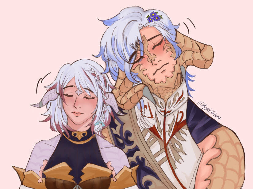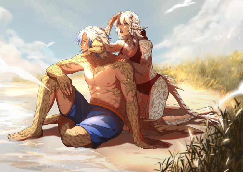 Origin: Saran is a Aura from Kugane. She met her now Husband in Kugane when she was at the age of 16 Saran and her Parents moved to Sharlayan in the Dravanian Hinterlands (Now in ruins) and soon later married to Siban. Years later after she got married she gave birth to Dani in Dravainan Hinterlands. They lived there for a few more years until Calamity struck and they had to evacuate. They now live in Old Sharlayan. She wasn't born with white scales, a science experiment went wrong and turned her scales white.